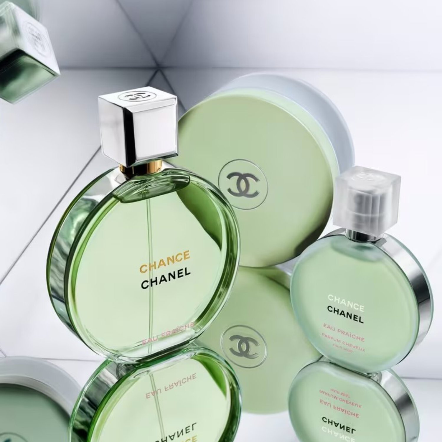 - Frasco Icónico: El frasco circular y minimalista de la línea Chance, con un tapón plateado y un zumo de color verde claro que evoca frescura y naturaleza.